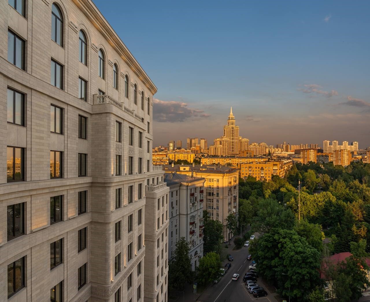 — Арочные широкоформатные окна с панорамными видами на Триумф Палас и город